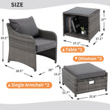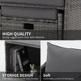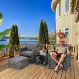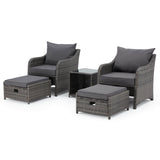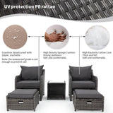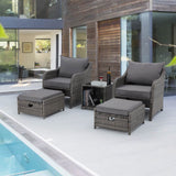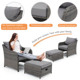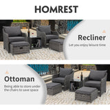 5 Pcs Patio Wicker Recliner Lounge Chair Set with 2 Ottomans, Grey Cushion & Coffee Table