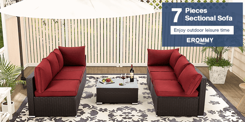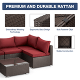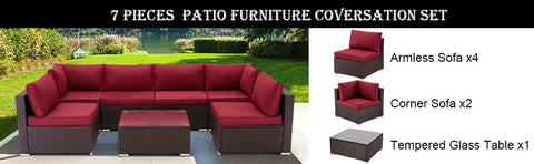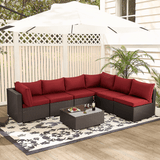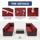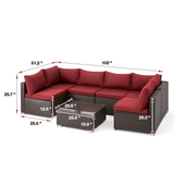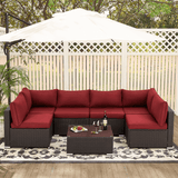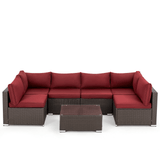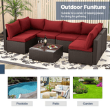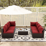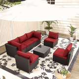 7 Pcs Patio Furniture Set All Weather Sectional Sofa w/ Red Cushion & Coffee Table