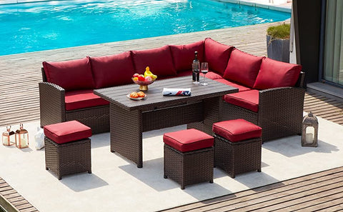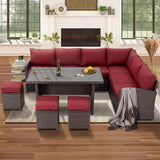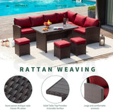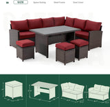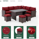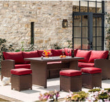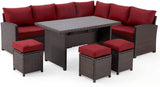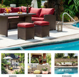 7 Pcs Patio Dining Set All Weather Outdoor Sectional Furniture w/ Ottoman, Red Cushion