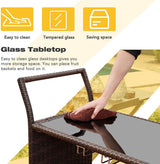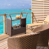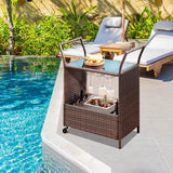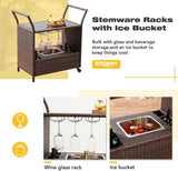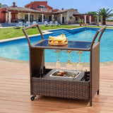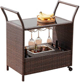 Outdoor Wicker Bar Cart Patio Serving Counter Table w/ Removable 12L Ice bucket, Glass Top, Wine Rack & Wheels