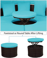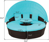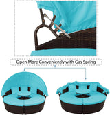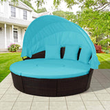 Patio Round Daybed Furniture Set with Retractable Canopy, Coffee Table & Waterproof Cushions, Outdoor Wicker Rattan Sectional Sofa Set, Blue
