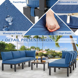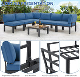 YODOLLA 7 Pieces Outdoor Patio furniture Set Clearance Metal Patio Sectional Sofa Set on sale with Navy Blue Cushions and 30" Fire Pit Table