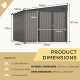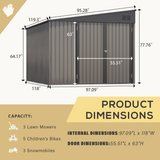 - Spacious Space Unlike those undersized shed, YODOLLA metal shed measures 97.09"L x 118"W x77.76"H, offers spacious, convenient storage of your landscaping equipment & gardening supplies.