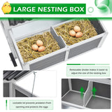 - 【COMMODIOUS & COSY】 Overall Chicken house dimension: 95” L x 31.5” W x 47.3” H, Main House Area: 9ft², Ground Activity Area:20.8ft².Otherwise, our chicken coup has large nesting boxes for hen to relax&lay and also a removable tray convenient for daily cleaning.