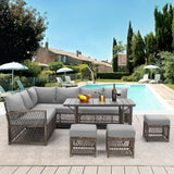 AECOJOY Patio Furniture Set with Cover, 7 Pieces Wicker Outdoor Sectional Sofa with High Table and Chairs, All Weather PE Rattan Conversation Dining Set with Ottoman, Grey Cushions