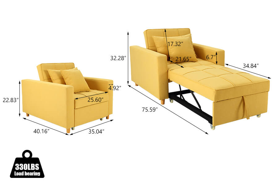 Sofa Bed 3-in-1 Convertible Chair Multi-Functional Sofa Bed Adjustable Recliner(Yellow)