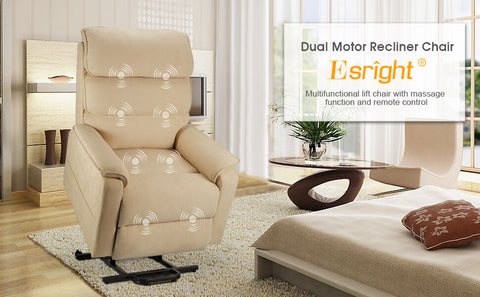 Dual Motor Electric Power Recliner Lift Chair, Linen Fabric Electric Recliner for Elderly, Heated Vibration Massage Sofa with Side Pockets & Remote Control, Cream Beige